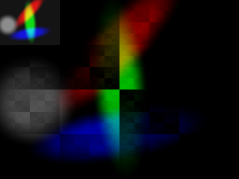 [SpotLight1] Position = (0, 0, -10) Scale = (10, 3, 1) AngularVelocity = 90 Color = (0, 200, 0) Graphic = SpotLightGraphic BlendMode = add [SpotLight2@SpotLight1] Position = (0, -150, -10) AngularVelocity = 45 Color = (200, 0, 0) [SpotLight3@SpotLight1] Position = (0, 150, -10) AngularVelocity = 180 Color = (0, 0, 200) [SpotLight4@SpotLight1] Position = (0, 0, -10) Scale = 5 AngularVelocity = 0 Color = (120, 120, 120) FXList = SpotLightFX [SpotLightGraphic] Pivot = center Texture = SpotLightTexture